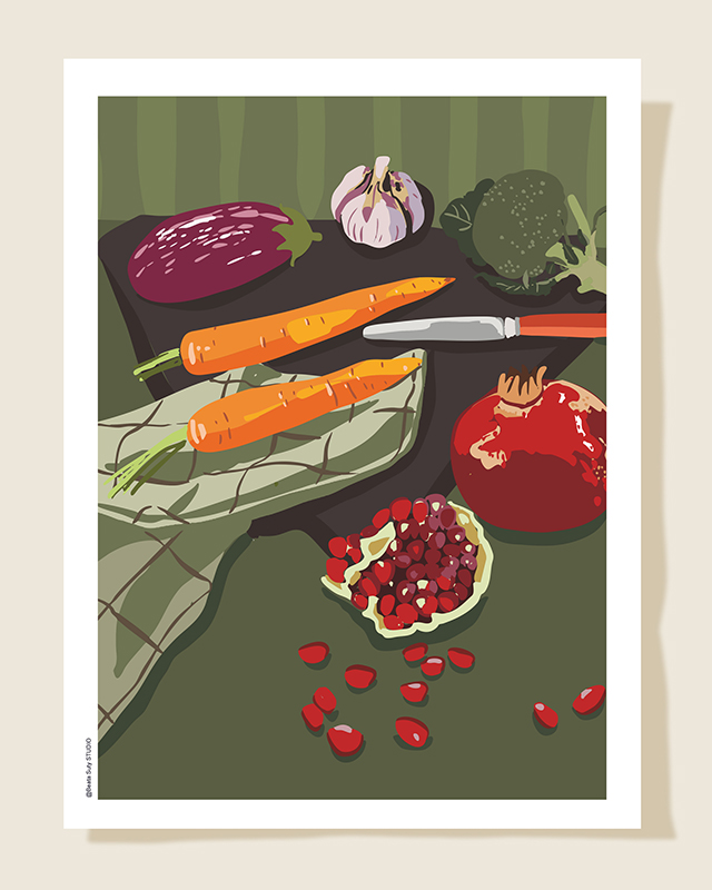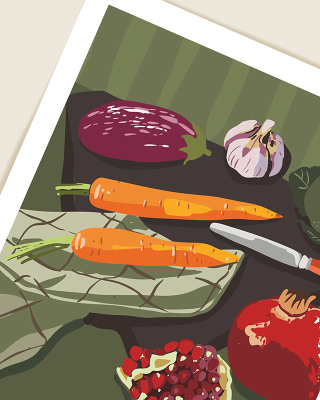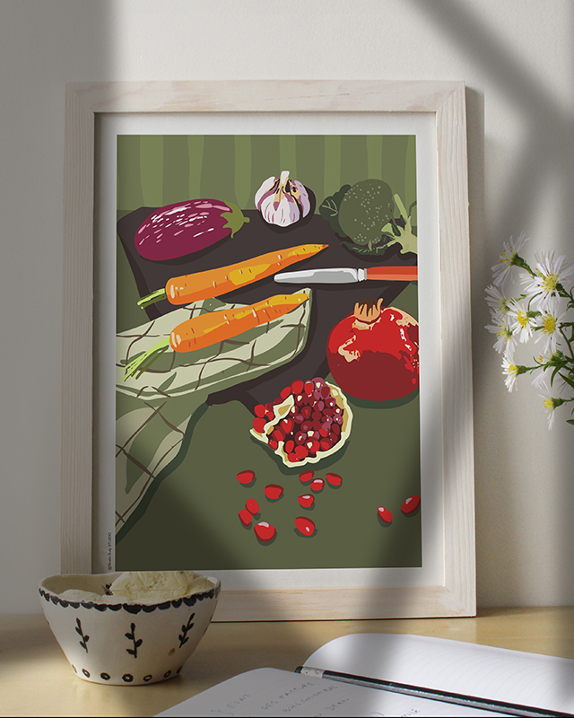 Affiche déco – art mural au style moderne, mettant en scène des légumes illustrées avec des rayures graphiques, dans une ambiance claire et élégante.