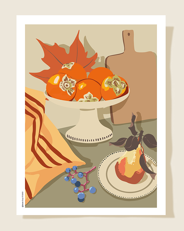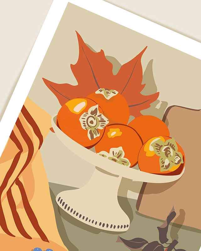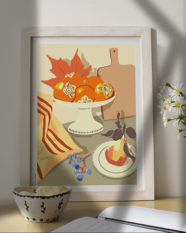 Affiche déco – art mural au style moderne, mettant en scène des kakis illustrés sur un fond à rayures graphiques, dans une ambiance claire et élégante.